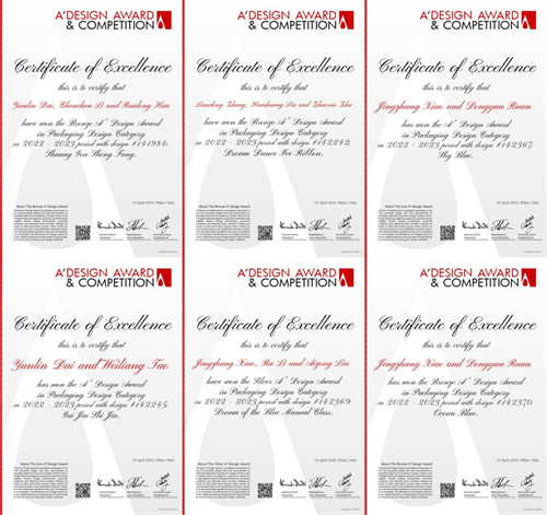 近日,享誉全球的2022-2023意大利A' Design Award 大奖赛获奖名单正式发布,9001cc 以诚为本股份“梦之蓝手工班(大师)、梦舞冰丝带、海之蓝、天之蓝、双沟圣坊和贵酒世家”6款产品荣获设计奖。